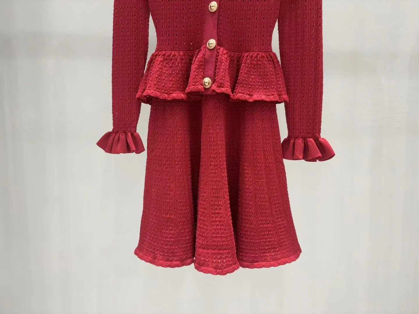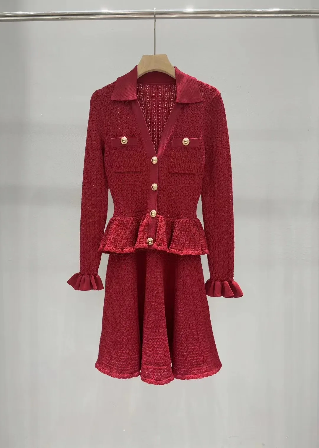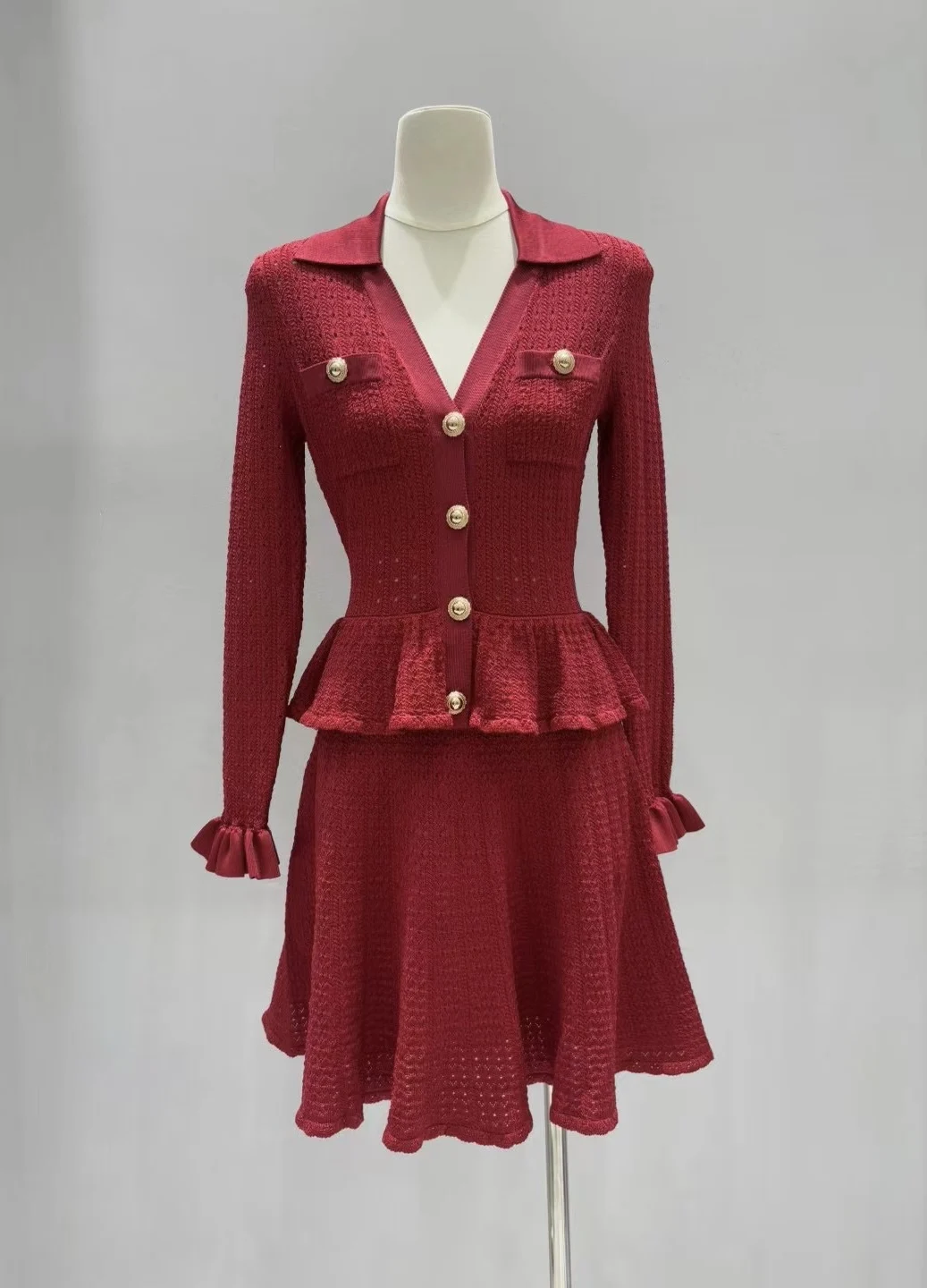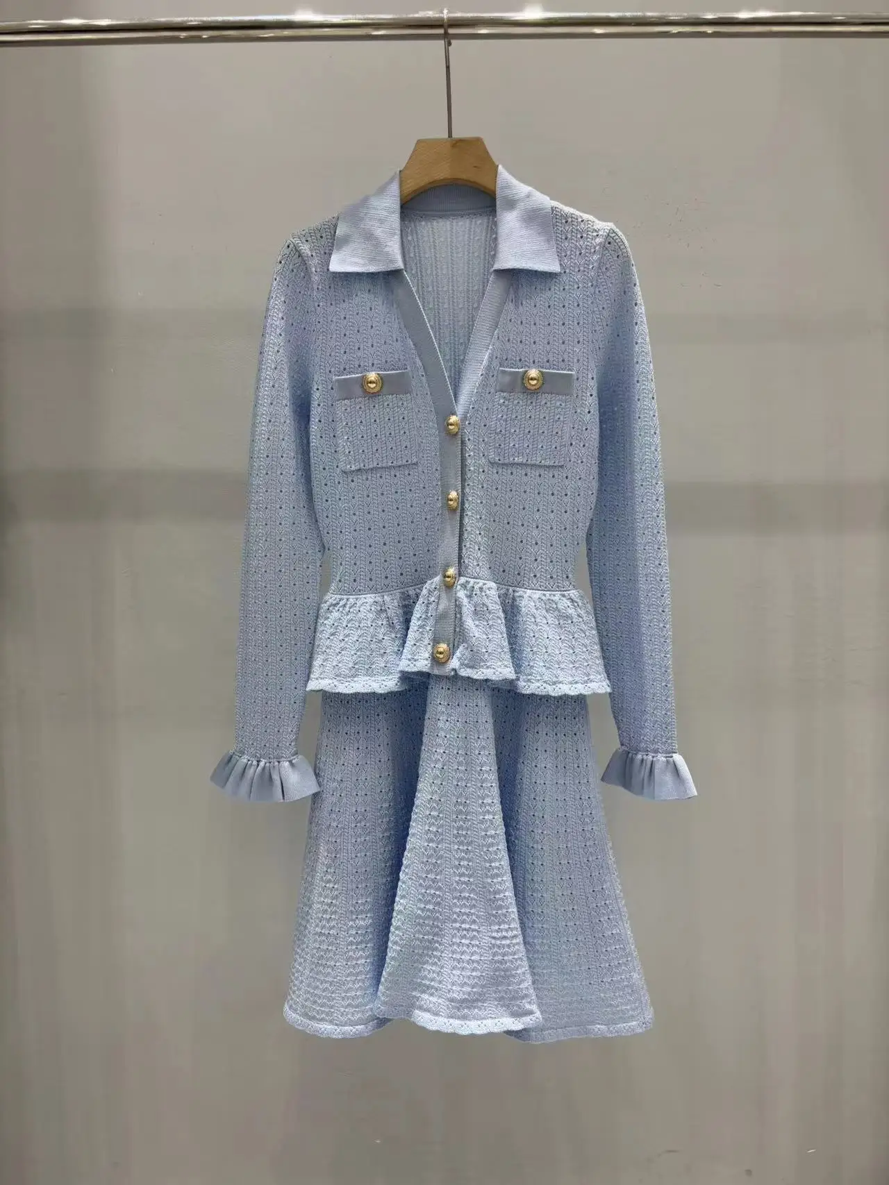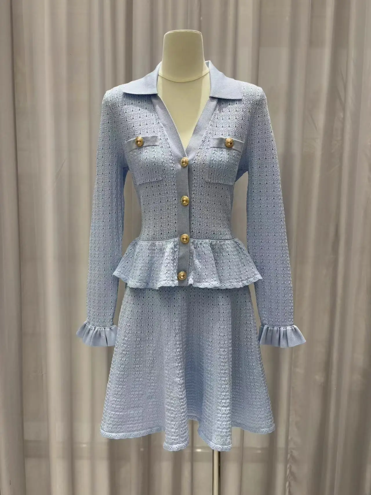 2025 new dress women knitted sweater V-neck ruffled cutout knitted dress matte blue slimming figure-accentuating evening dress