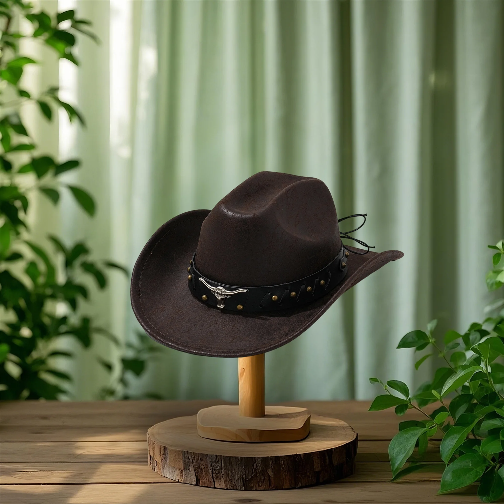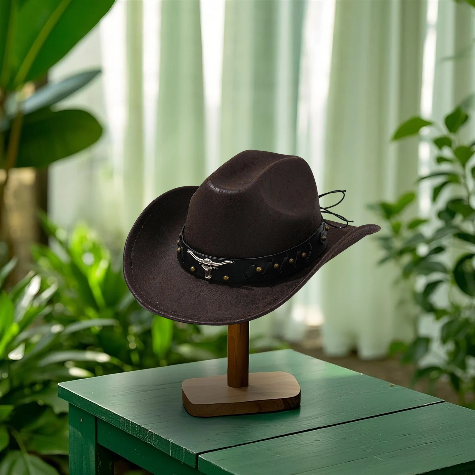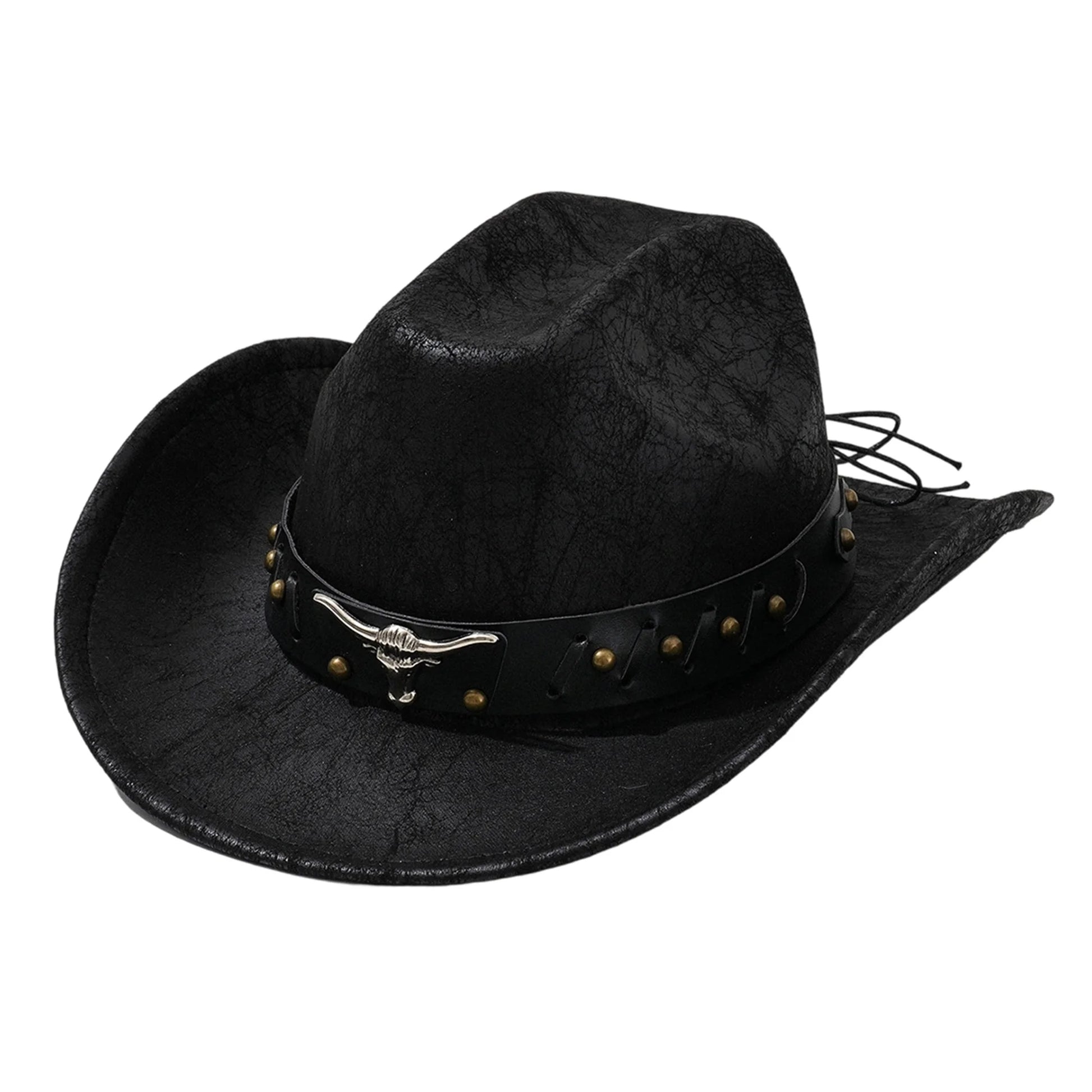 PU Leather Cowgirl Hat Trendy Western Hat with Rivet Bull Head Belt Party Cap for Women Men