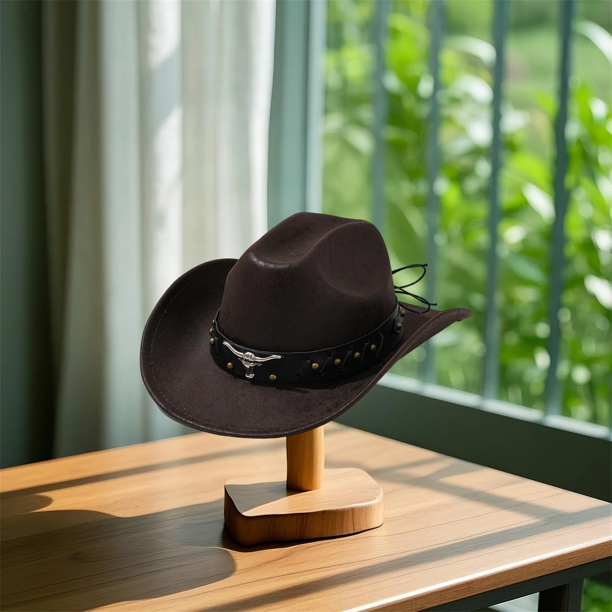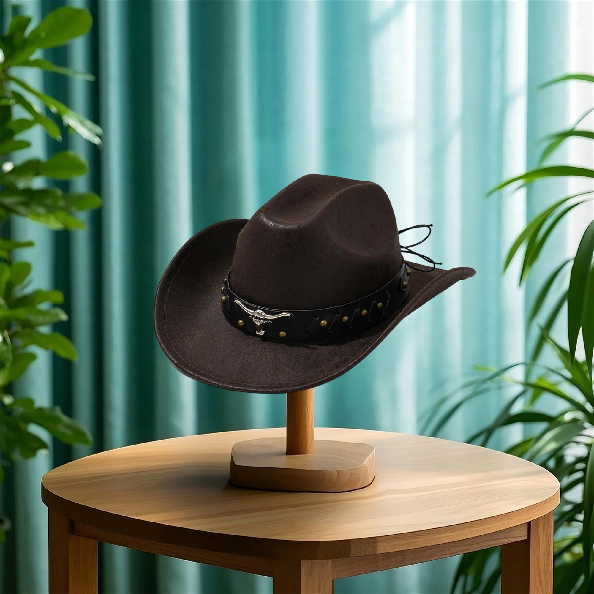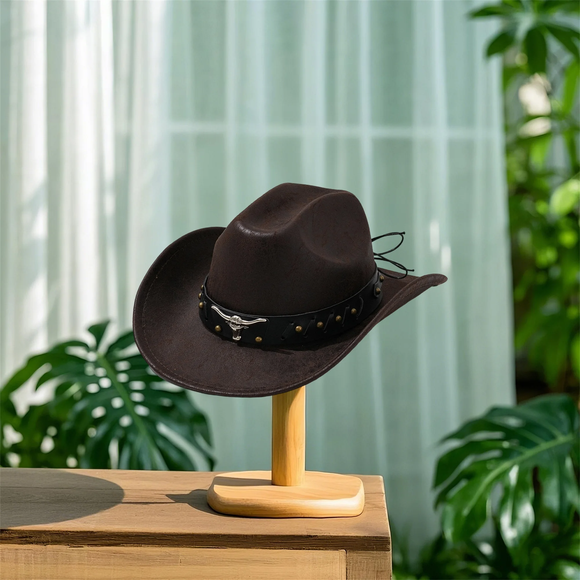 PU Leather Cowgirl Hat Trendy Western Hat with Rivet Bull Head Belt Party Cap for Women Men