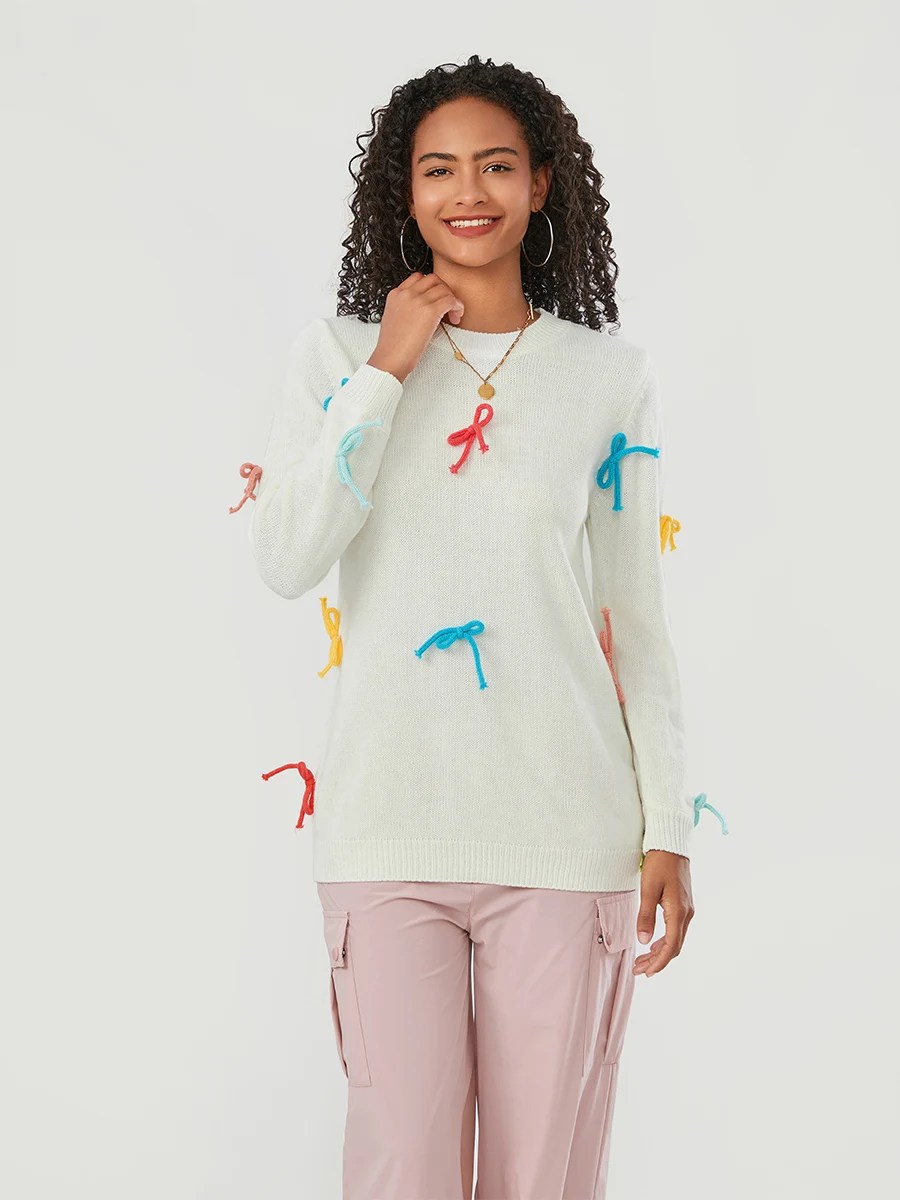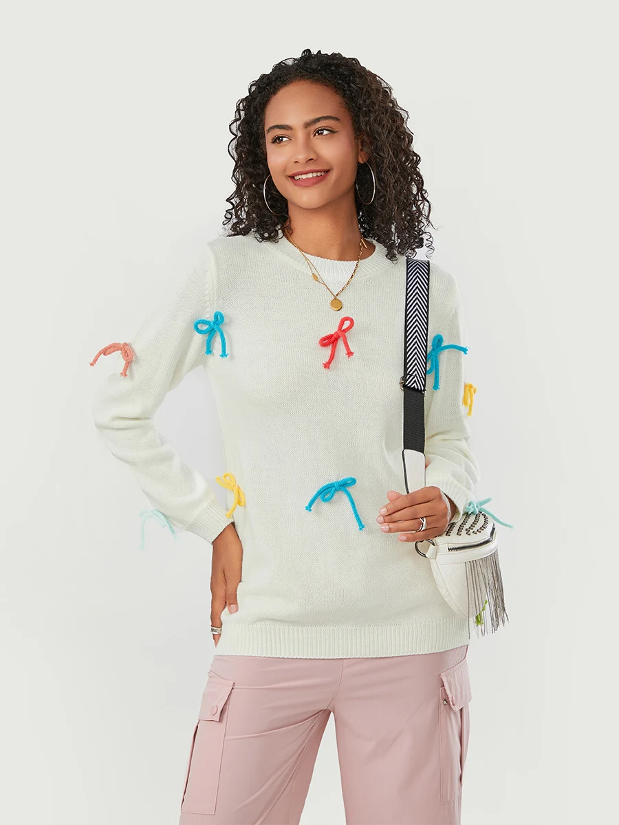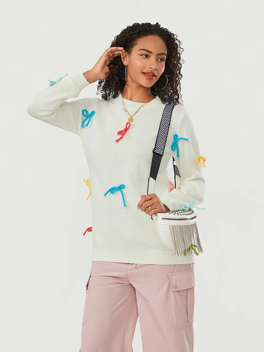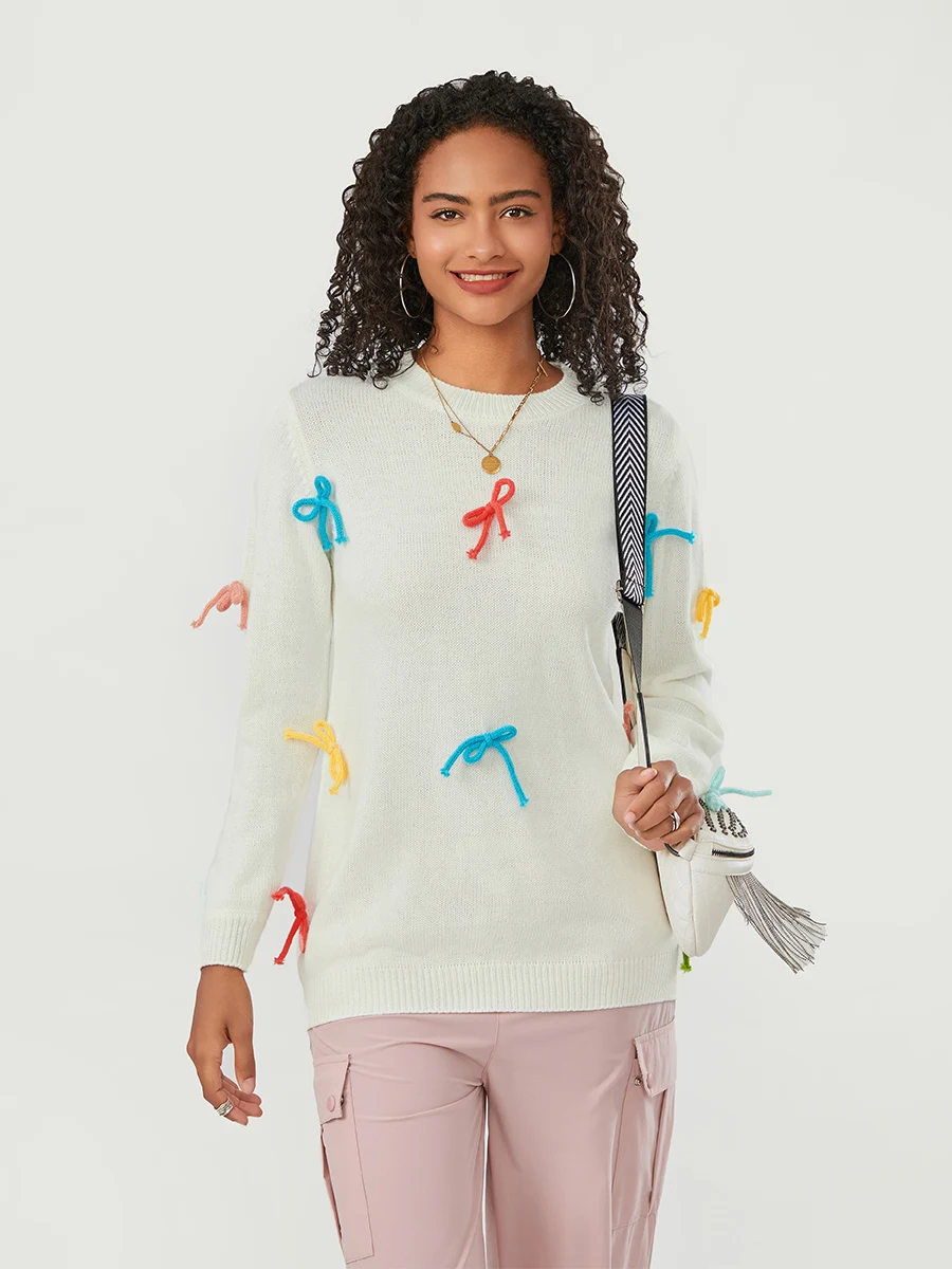 Colorful bow decoration, round neckline, long sleeves, fashionable and comfortable, winter sweaters for women, pullover sweaters for women, cute sweaters for women, crew neck sweaters for women, perfect addition to your fall closet.