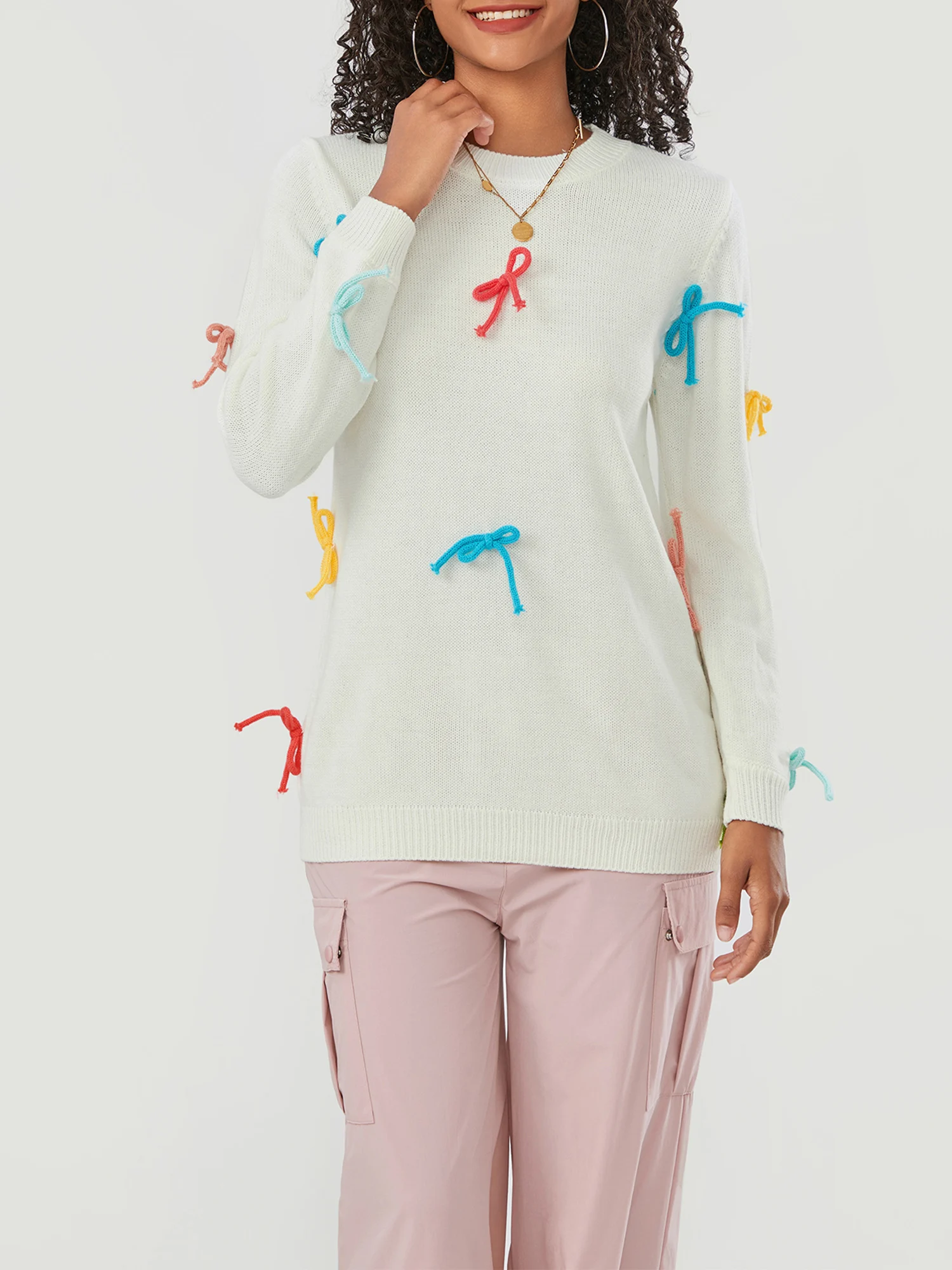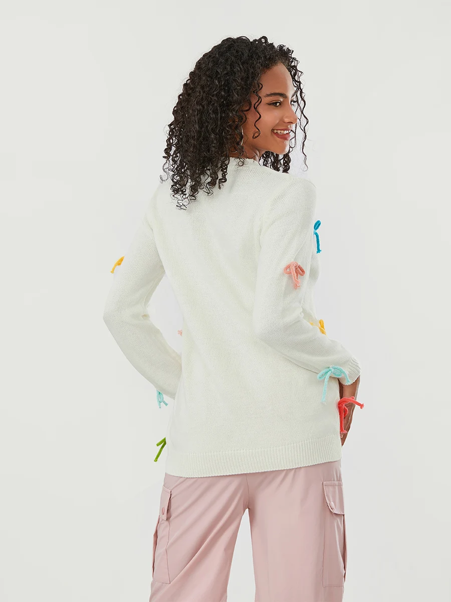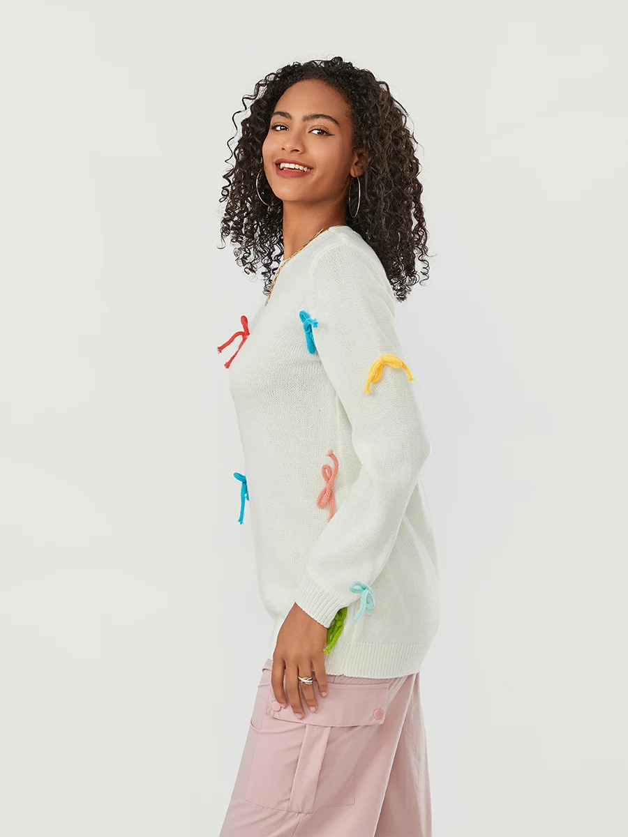 Women Cute Sweaters Casual Colorful Bow Warm Long Sleeve Pullover Basic Knitwear for Fall Streetwear